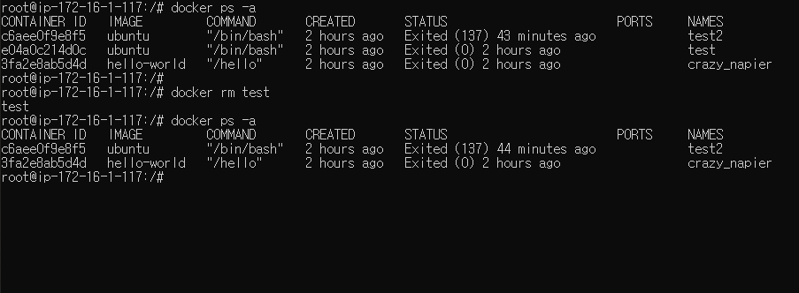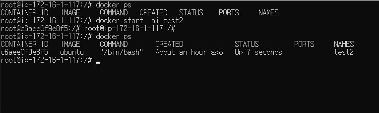 나가고 난 후 docker -ps 확인 해보면 컨테이너 실행이 되고 있는걸 볼 수 있음