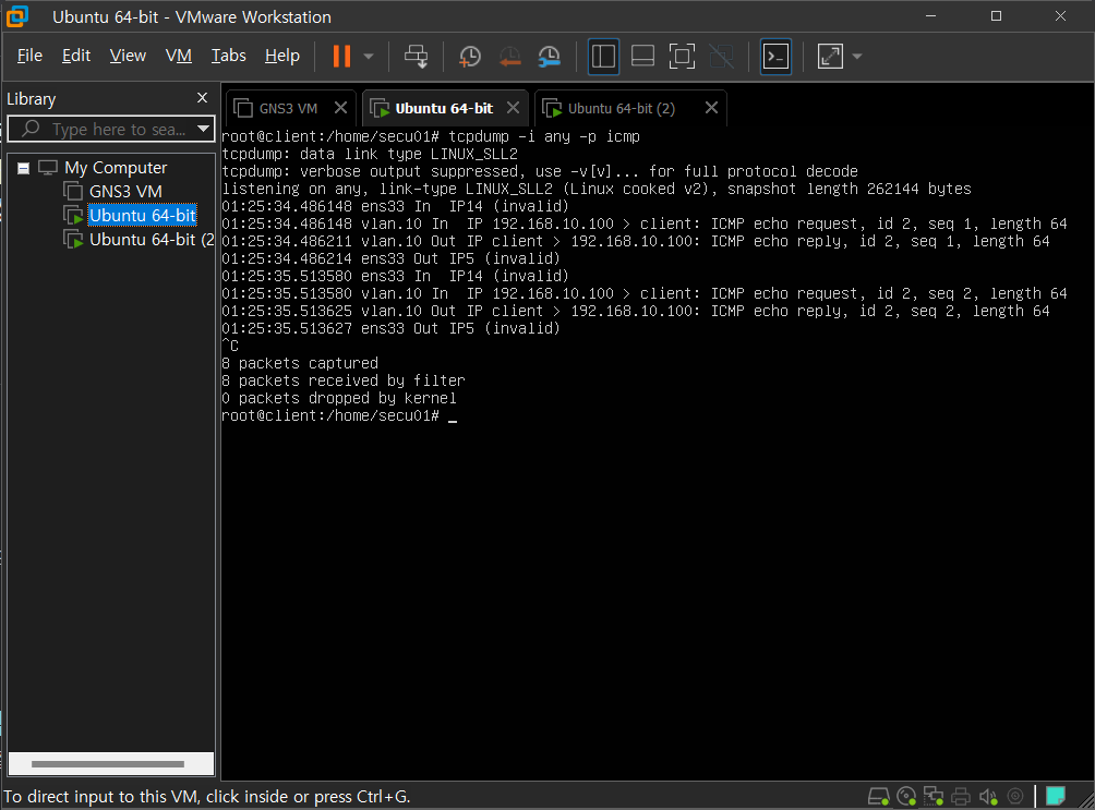 사실 VMware workstation이 아닌 window hypervisor나 kvm이라면 여기까지만 읽어도 좋다. 아 그리고 vmnet을 bridge로 설정한 사람이라면 여기까지 읽어도 좋다. 아래 사진과 같이 tcpdump를 이용하면 이쁘게 vlan.10을 이용하는 모습을 볼 수 있을테니까