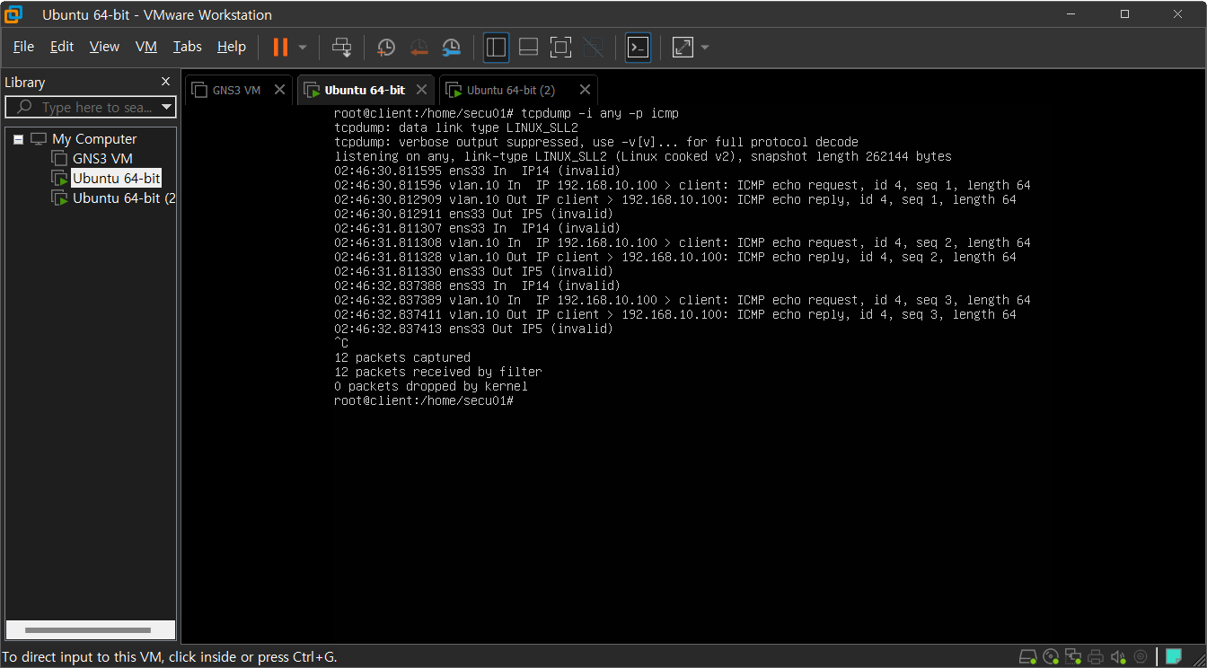 이제 다시 위 설정을 적용하고 핑을 보낸 후 tcpdump를 이용하여 캡쳐하면 vlan을 이용하여 정상적으로 통신하는 것을 확인할 수 있다.