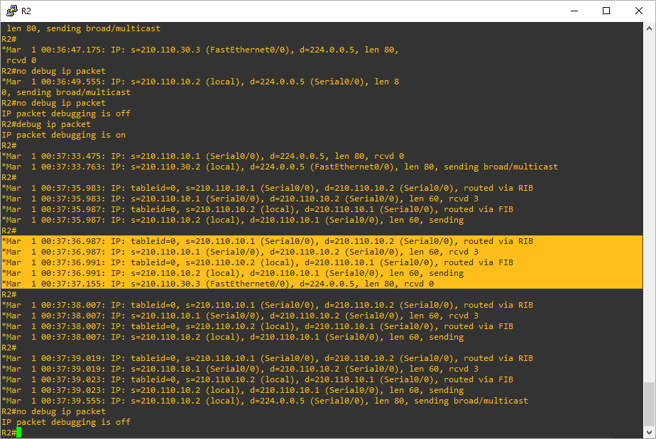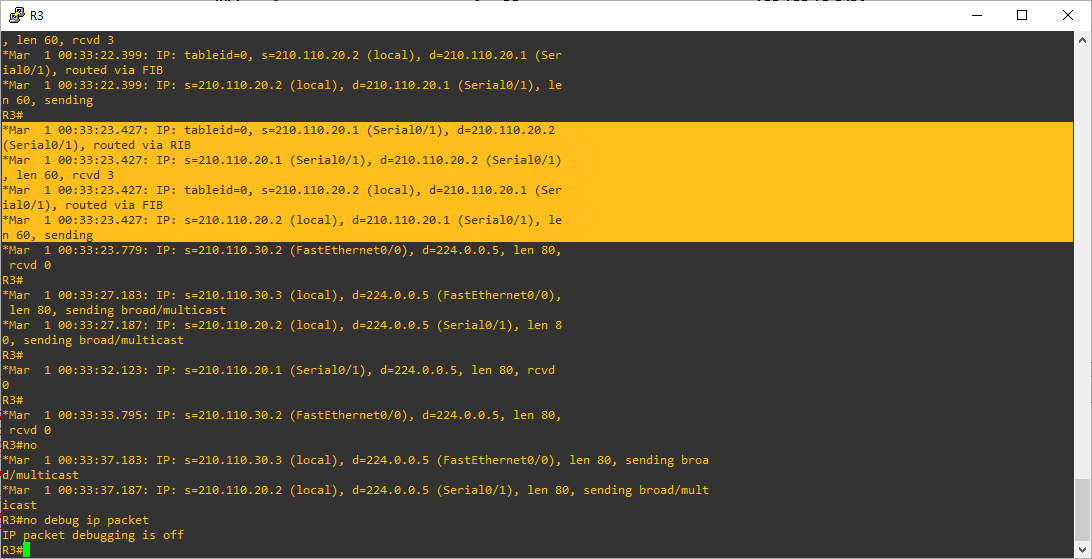 ip nat inside source route-map nat1 interface s0/1 overload위 명령어를 통해서 구축할 수 있다. 구성이 정상적으로 확인 되었는지 확인하기 위해 R2와 R3에서 debug ip packet 명령어를 통해 확인해보도록 하겠다.