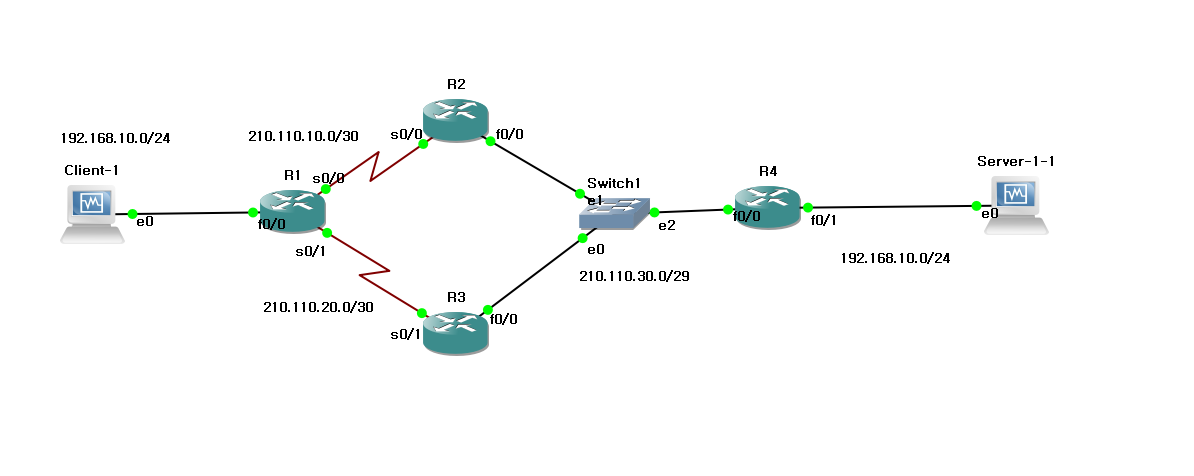 앞의 토폴로지에서 더 나아가 이번에는 PBR을 이용해 SSH 같은 관리 트래픽은 R2를 이용해서 통신하고 그 외의 나머지 트래픽은 R3를 통해 통신할 수 있도록 해보겠다.