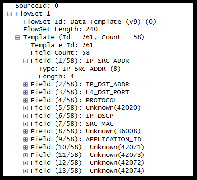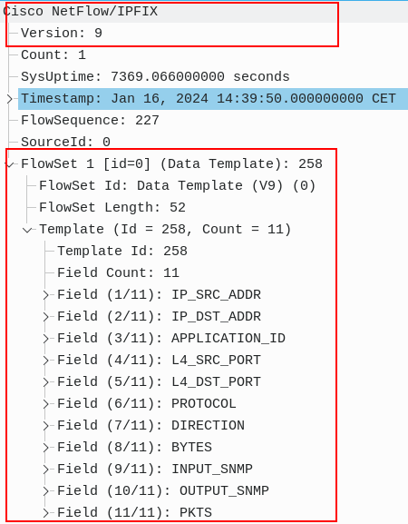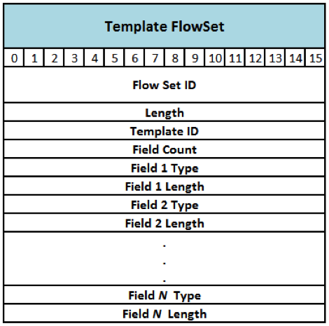 | 플로우셋 ID | FlowSet ID는 템플릿 레코드와 데이터 레코드를 구분하는 데 사용됩니다. 템플릿 레코드는 항상 0~255 범위의 FlowSet ID를 갖습니다. 현재 플로우 필드를 설명하는 템플릿 레코드는 FlowSet ID가 0이고, 옵션 필드(아래 설명 참조)를 설명하는 템플릿 레코드는 FlowSet ID가 1입니다. 데이터 레코드는 항상 0이 아닌 255보다 큰 FlowSet ID를 갖습니다. |