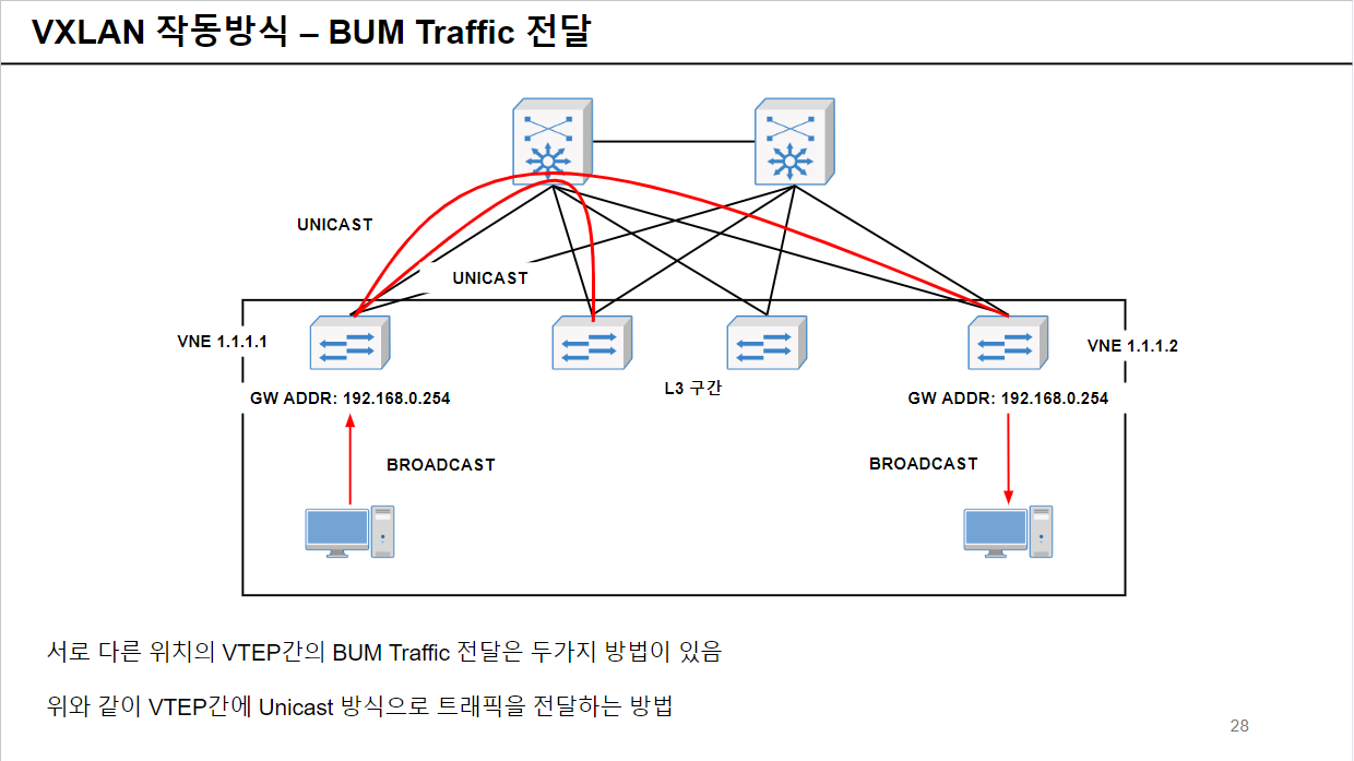 ARP나, DHCP 등등의 다양한 사유로 Broadcasting이 일어날 수 있다. 하지만 VXLAN을 통해 L2 확장을 했다고 하여도 VTEP간의 경로를 엄연한 L3 구간 이기 때문에 전달해야될 BUM Traffic을 전달할 수 없다.