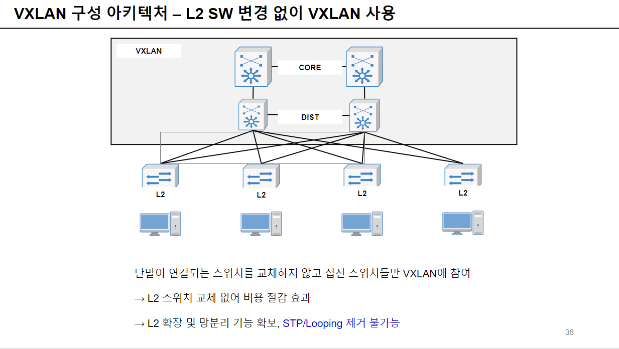 단말이 연결되는 ACCESS SW는 기존 LEGACY로 변경없이 두고 그 윗단의 DIST-CORE 단을 VXLAN이 구현되는 LEAF SW로 변경