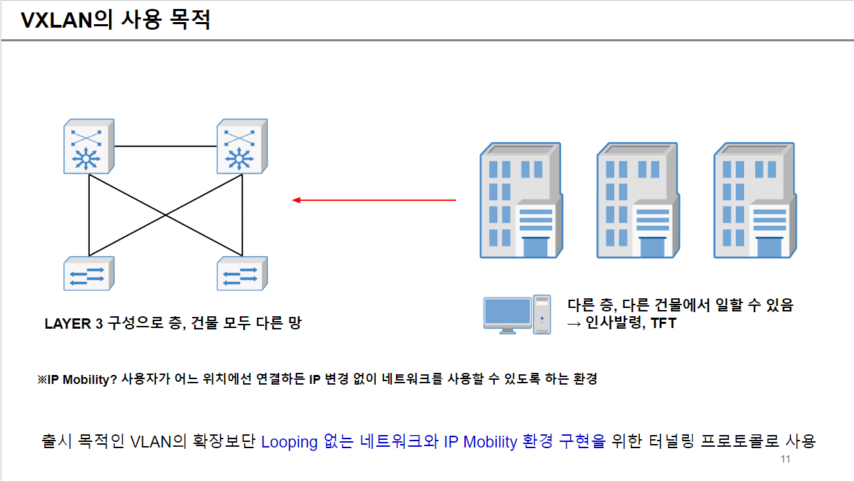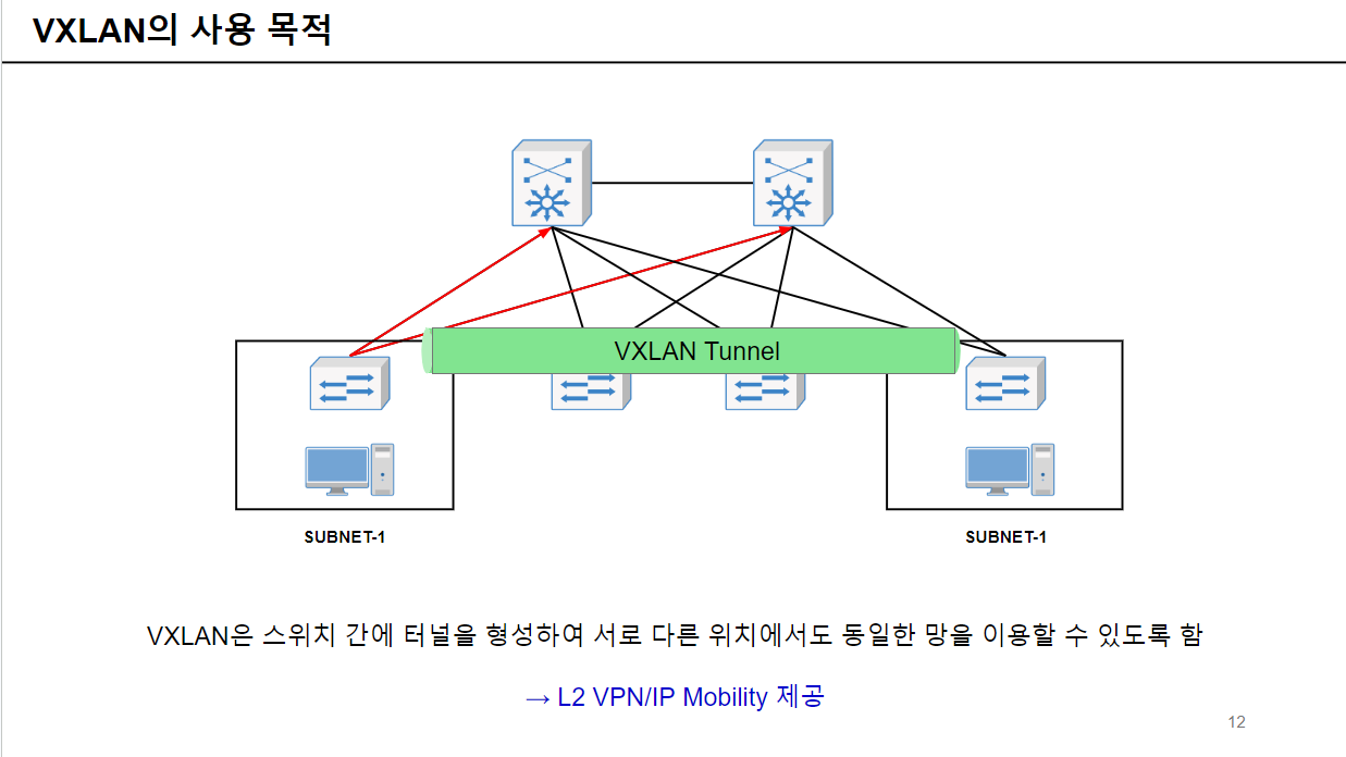 VXLAN의 정의는 VLAN의 확장이 목표이지만 실제로는 LOOPING 없는 네트워크와 IP Mobility 구현을 위해 터널링용으로 많이 사용된다.
