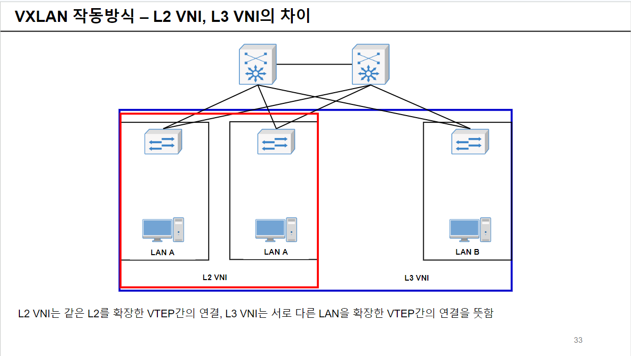 L2 VNI는 같은 L2를 확장한 VTEP간의 전달하는 VNI를 뜻하고, L3 VNI는 서로 다른 VNI 끼리 통신할 때 사용하게 되는 VNI이다.