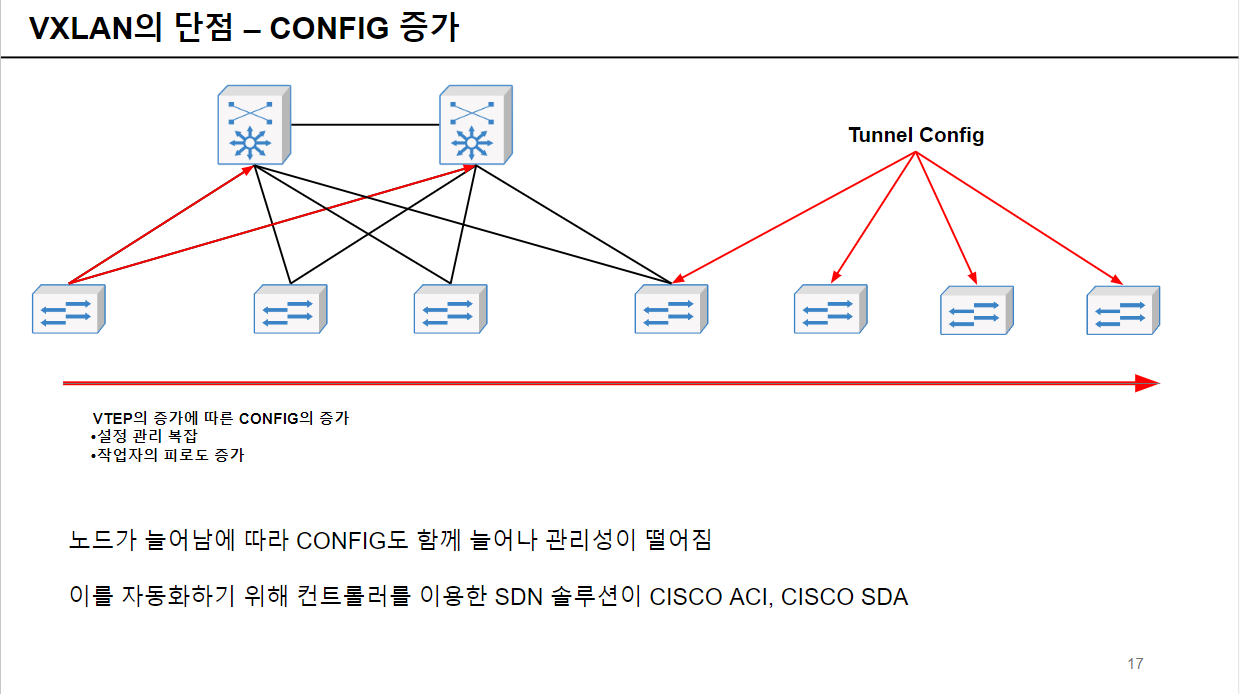 또 노드가 늘어남에 따라 VXLAN 터널 구성이 계속해서 늘어남으로 관리성이 떨어질 수 있고 작업자의 피로도가 증가할 수 있다는 단점이 있다.