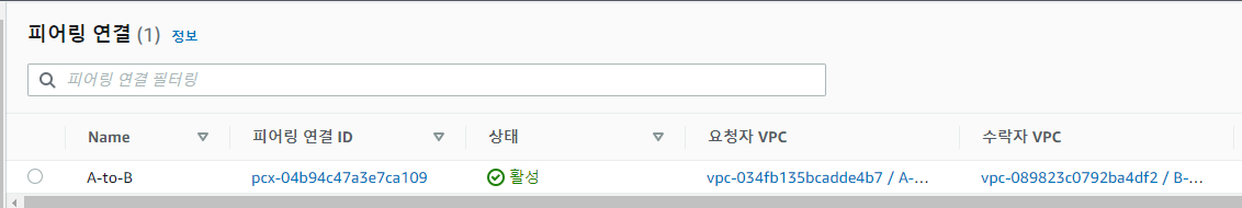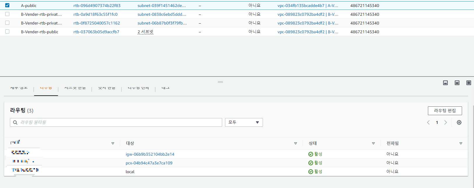 요청과 수락의 형태로 피어링을 맺기 때문에 활성화 해줄 피어링을 선택 해주고 작업 칸에서 요청 수락을 눌러 주시면 피어링 활성 상태가 됩니다. 이제 마지막으로 피어링을 통해 연결하기까지 마지막 단계가 남았습니다. 바로 라우팅 테이블 추가입니다.