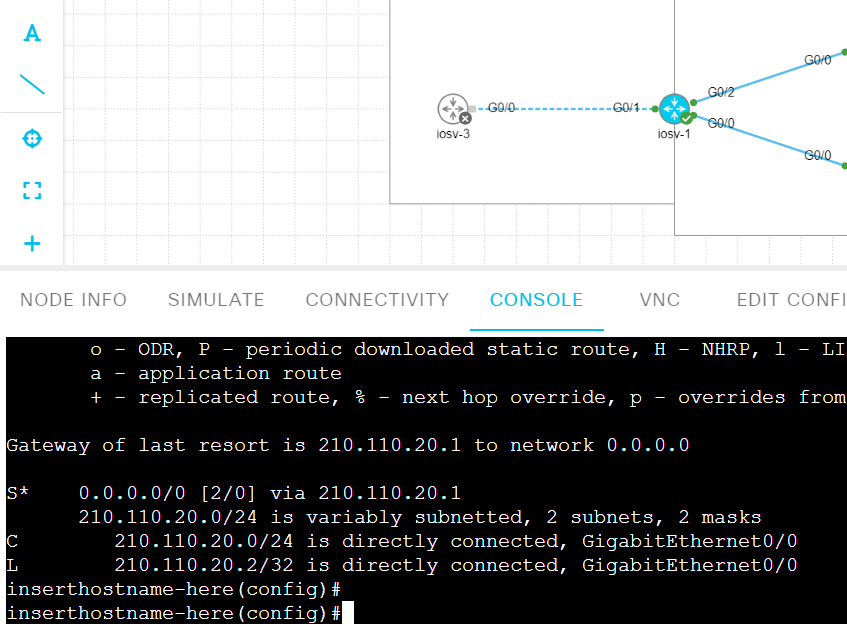 IOSv1에 2개의 일반적인 디폴트 라우팅을 구성해보았습니다, 다른 AD 값을 주어서 210.110.10.1로 라우팅 되도록 구성 했습니다. 위와 같이 구성하면 210.110.10.1로 라우팅 하다가 사고 발생시 210.110.20.1 로 라우팅 되게 됩니다.
